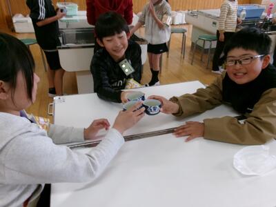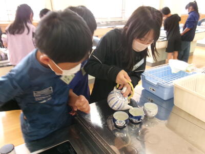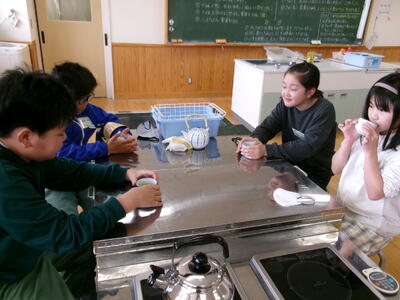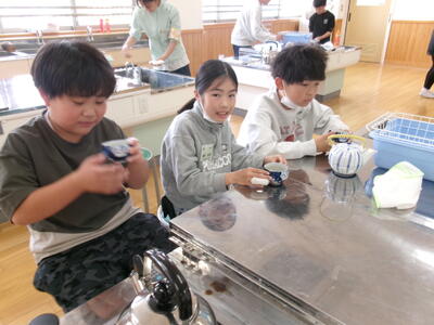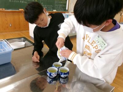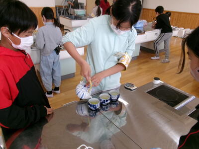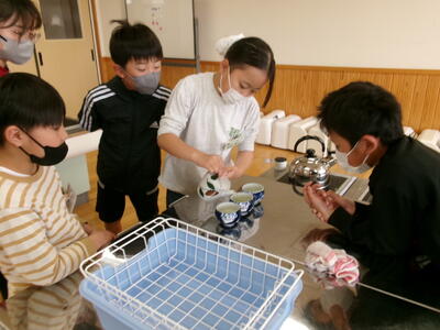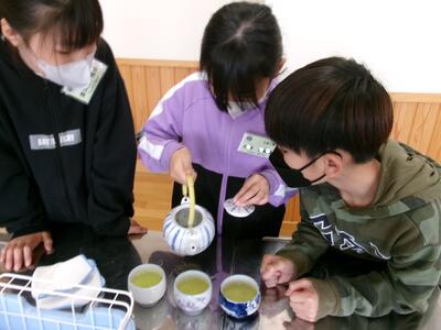 コンロでお湯を沸かしたり、茶葉を人数分急須に入れたり、注ぎ分けたりしました。班ごとの団らんも楽しかったようです。