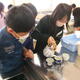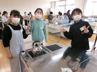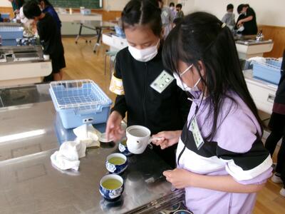 5年生の家庭科で最初に行う調理実習のお茶いれです。この実習は、家庭での「団らん」を深めるきっかけとしても大切にされています。