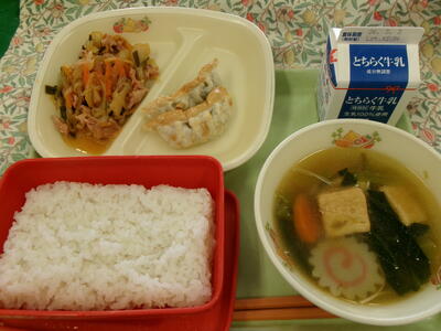 2月17日(火) 投稿: HP担当 (02/17) ★ごはん・牛乳・豚キムチ炒め・県産豚肉にら入り餃子・くきわかめのスープ★ 栃木県産の豚肉とニラが入った餃子。豚キムチ。ごはんがすすむメニューでした! -