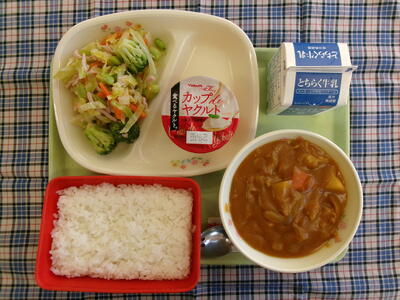 12/18(木) 投稿: HP担当 (17:27) ★有機米ごはん・牛乳・ポークカレー・フレンチサラダ・カップdeヤクルトヨーグルト★ 給食のカレーには、かくし味として、ある調味料が入っています。それは、何でしょう・・・? 1 ケチャップ 2 しょうゆ 3 マヨネーズ 答えは、1のケチャップです🍅 調理員の皆さん、いつも美味しい給食を、ありがとうございます! -