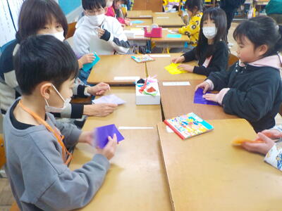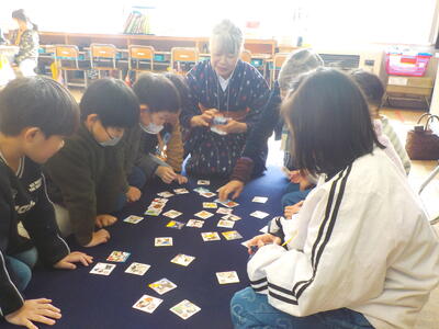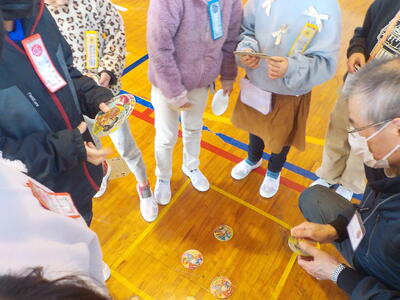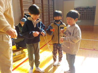 今回は「おはじき」「かるた」「あやとり」「お手玉」「おりがみ」「こま・けん玉」「だるまおとし」「竹とんぼ」「めんこ」など、それぞれのブースで、地域の方々に教えてもらいながら「むかしのあそび」を楽しみました。
