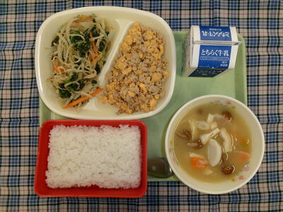 10/6(月) 投稿: HP担当 (13:23) ★ごはん・牛乳・二色丼の具・ごまあえ・なめこ汁★ 前期も残り一週間となりました。今日の給食は、二色丼でした。ごはんにかけて食べるおかずの日は、ごはんのお残しが少ない傾向にあります。 卵の甘みと、そぼろのしょっぱさのバランスがよく、ごはんとよく合っていて、とても美味しかったです🥚 -