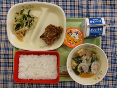 10/31(金) 投稿: HP担当 (17:39) ★ごはん・牛乳・鶏肉のソースから揚げ・からしあえ・わかめスープ・ハロウィンデザート★ 鶏肉のソースから揚げは、ウスターソースに漬け込んでから衣をつけて揚げた、ピリッとスパイシーな色の黒いから揚げです。ソースのうま味と香りが食欲をアップさせ、ごはんが進むメニューです✨ 今日のデザートは、ハロウィンということで、かぼちゃ味のババロアでした🎃 -
