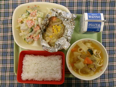 12/22(月) 投稿: HP担当 (17:43) ★ごはん・牛乳・鮭のちゃんちゃん焼き・れんこんサラダ・ほうとう汁★ 今日の給食は、冬至献立です。冬至は、一年の中でもっとも昼が短く、夜が長い日のことです。日本では昔から、風邪をひかず、元気に過ごせるように、「ゆず湯に入る」、「かぼちゃを食べる」といった習慣があります。 かぼちゃにはビタミンがたっぷりふくまれ、寒い冬をのりこえる力をくれます。 -