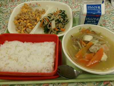 ★県産麦ごはん・牛乳・二色丼の具(肉そぼろ・炒り卵)・春菊のごまあえ・スキー汁★