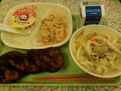 2月4日(水) 投稿: HP担当 (13:25) ★小さいココア揚げパン・牛乳・チャンポンうどん・チキンサラダ・アセロラゼリー★ 長崎県発祥の麺料理「ちゃんぽん」。中華麺の代わりにうどんを使った「チャンポンうどん」。 具だくさんで、彩りも良く、子どもたちにとても人気なうどんです。 でも、もっと人気なものが「揚げパン」! 先生たちも大好きです♪ -