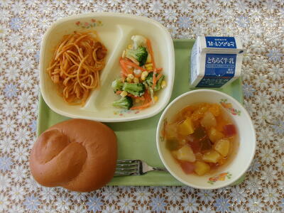 3月11日(水) 投稿: HP担当 (14:21) ★小さいいちごパン・牛乳・スパゲティナポリタン・花野菜サラダ・フルーツポンチ★ フルーツポンチは、紫小特製のシロップにサイダーと果物やゼリーをあわせたものです♪ シュワシュワッとおいしくいただきました! -