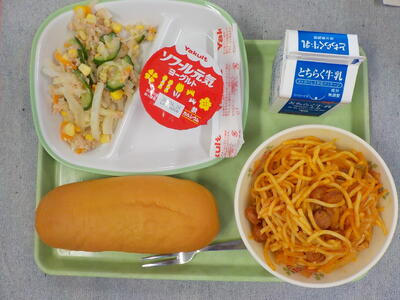 4月15日(水) 投稿: HP担当 (18:03) ★小さいはちみつパン・牛乳・スパゲティナポリタン・ツナサラダ・ヨーグルト★ 今年度初めてのパンの給食でした!給食中はナポリタンで口の周りを赤くしている子が多くみられ、とても微笑ましく思いました^^ -