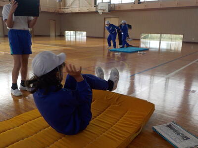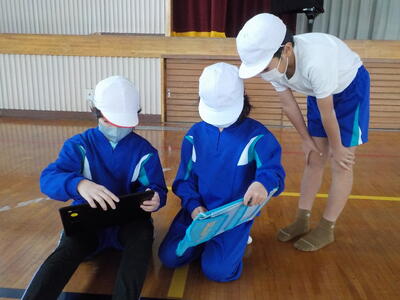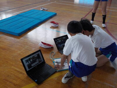 クロームブックで自分の技を撮影し、工夫改善しながら練習しています。