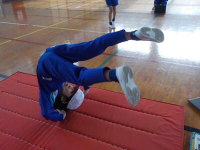 しゃがんだ姿勢から体を丸めながら後方に回転し、両手で押して立ち上がる後転。