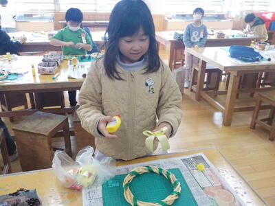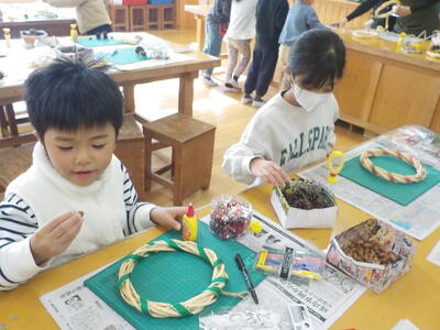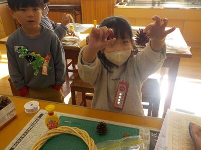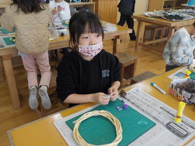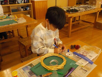 生活科の単元「秋をみつけよう」で、なす高原自然の家の先生を講師にお招きし、リース制作をしました。どのクラスも熱心に活動することができました。もっと飾りをつけたい子もいたようです。